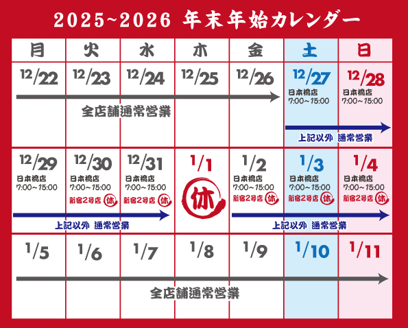 【 1月1日 休み 】 銀座店/有楽町店/御徒町店/新宿西口1号店/丸の内南口店/丸ビルマルチカ店 名古屋駅店/名古屋サンロード店/日本橋店(※日本橋店は12/27〜12/31、1/2〜1/4の営業時間 7:00〜15:00) 【12月30日〜1月4日 休み】 新宿西口2号店